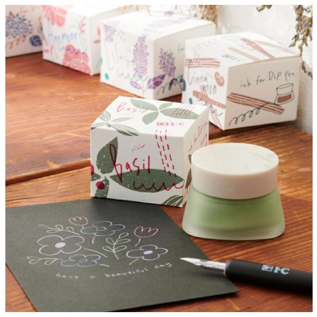 アイシープレミアムホワイトの技術を応用。隠蔽力が高く乾きの早い、つけペンに直接つけて描ける最適な粘度のインクです。