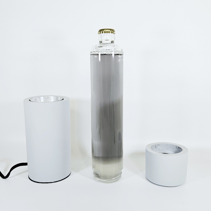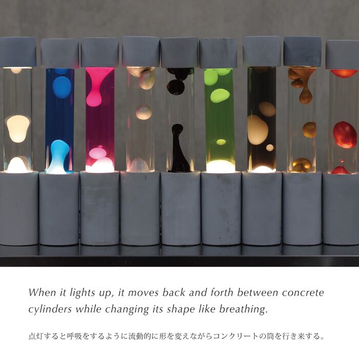 例えば、代表作であるDripping Lamp(ドリッピングランプ)は、コンクリートベースとガラスボトルを組み合わせ、光と液体のゆらぎで独特のリズムを演出します。素材の質感やフォルムの組み合わせにこだわりながら、どこかオブジェのような存在感を放つHUNT9のアイテム。
