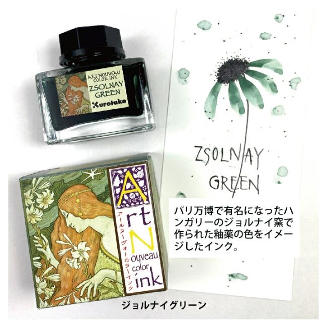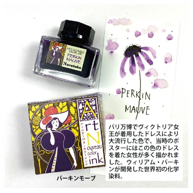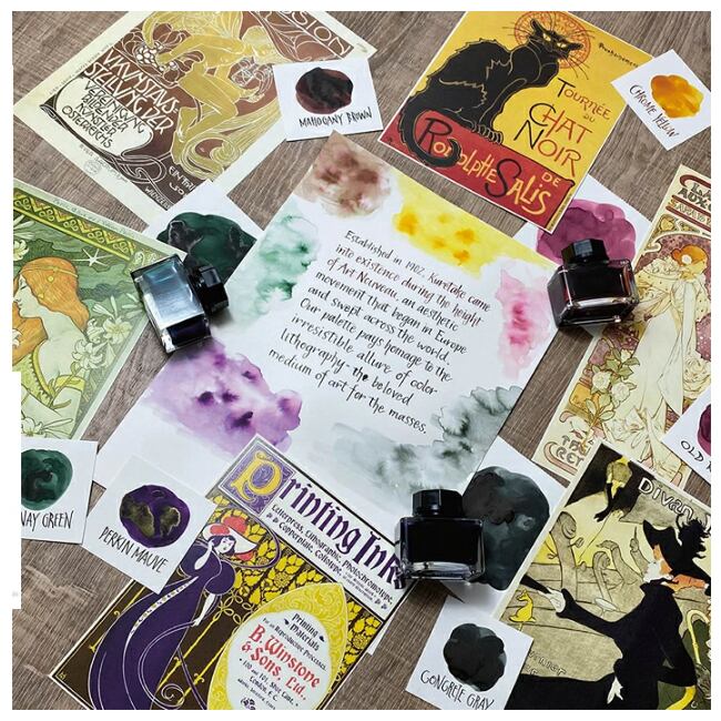 「アール・ヌーヴォーカラーインク」は呉竹創業当時に大衆芸術として人気を博したカラーリトグラフをモチーフに、時代の流行色をイメージしたカラーインクです。
