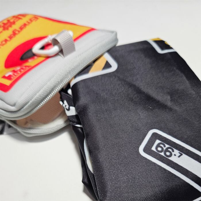 カラビナ付きポーチにエコバッグが入り持ち運び便利!