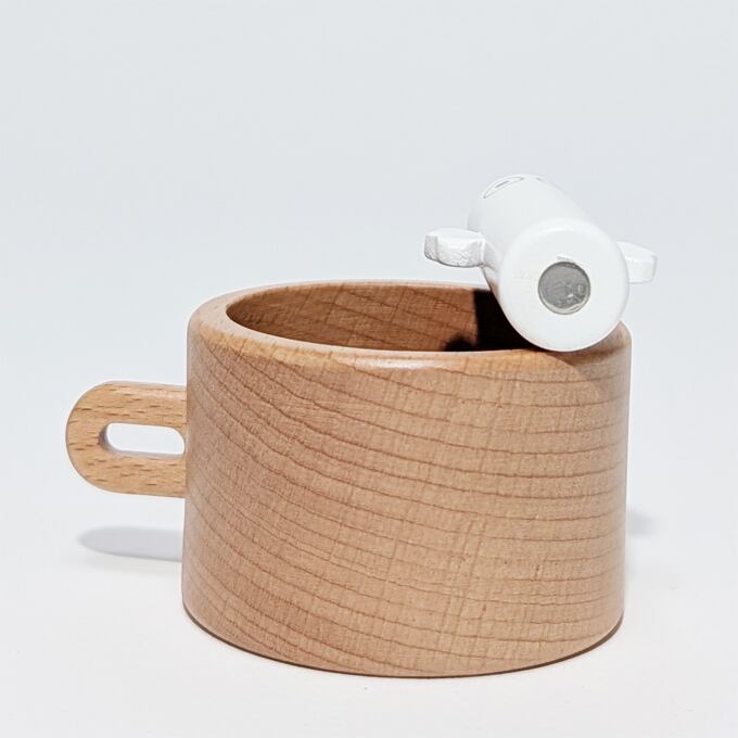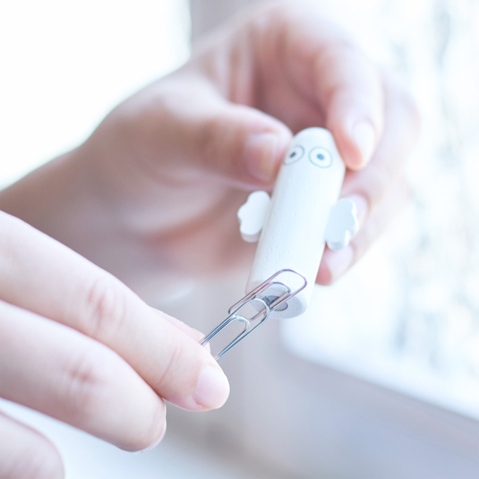 カップの中にいるニョロニョロを持ち上げると、底についたマグネットでクリップがくっつ