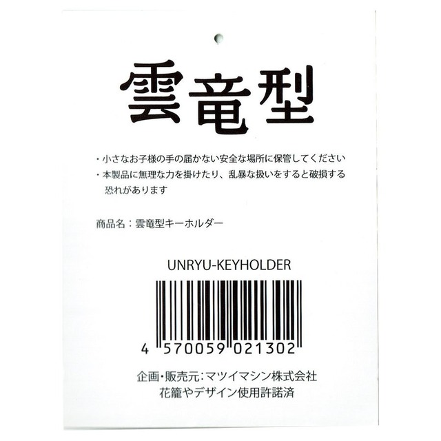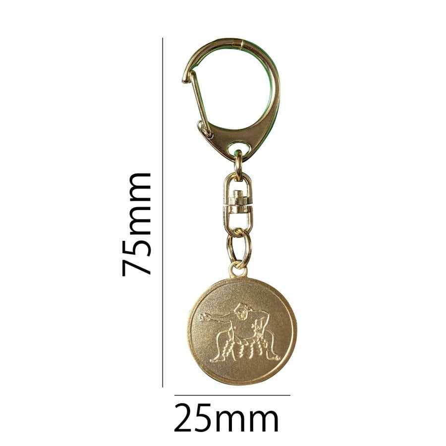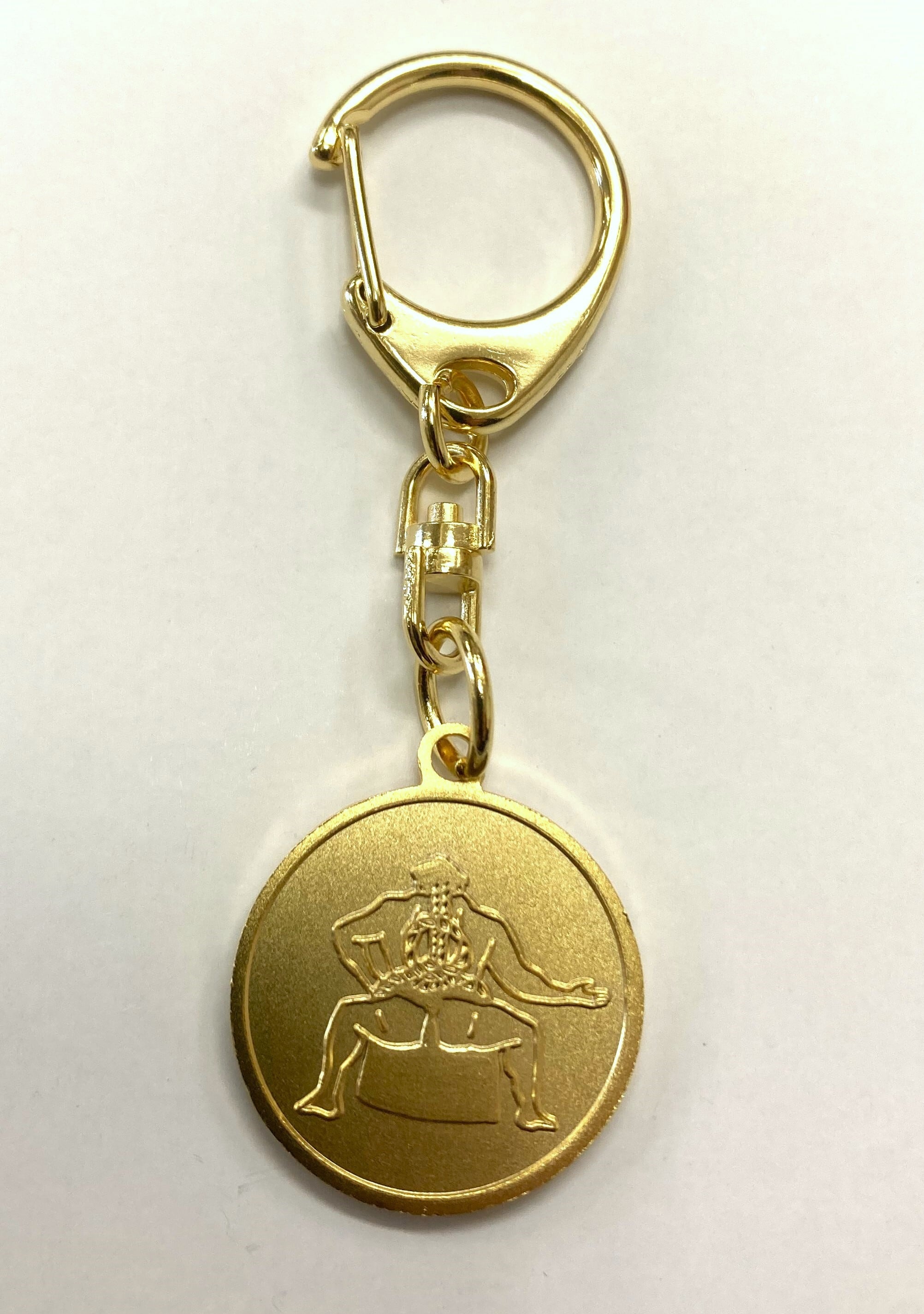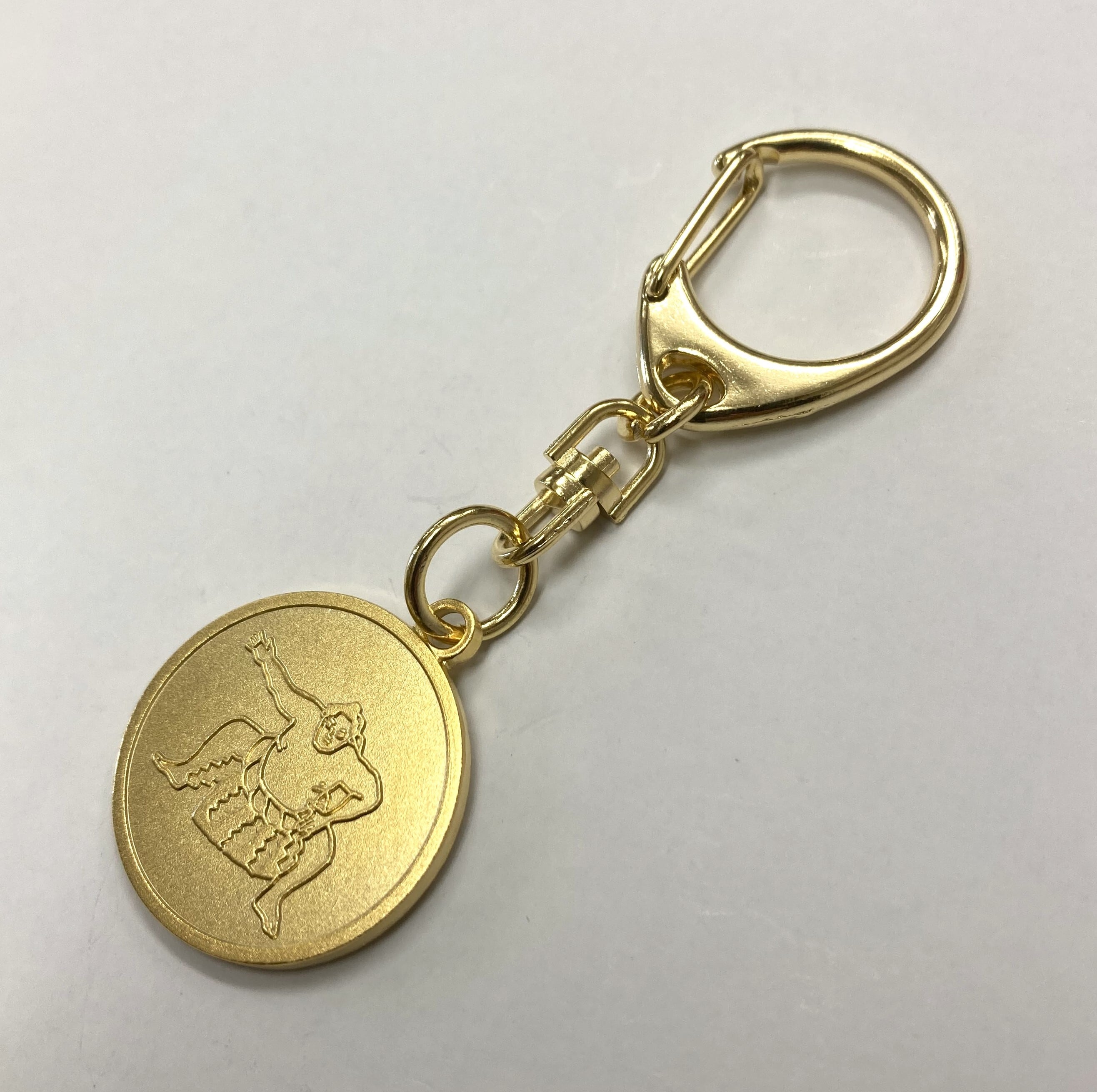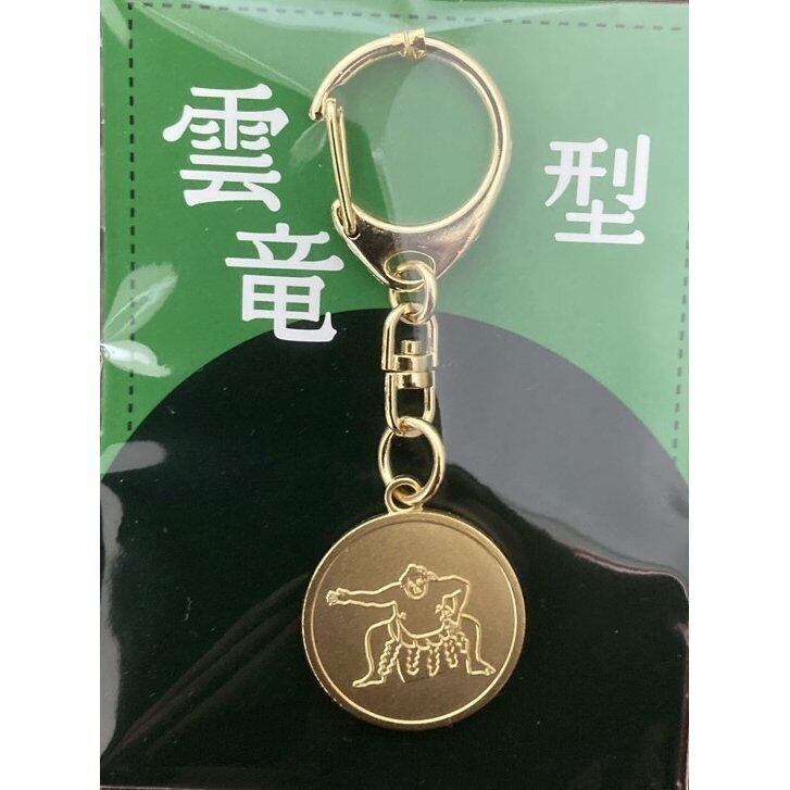 面白可愛い雑貨のお店「花籠や」のイラストを使用したキーホルダーです! 「守りの型」、雲竜型をゴールドのコインにあしらったシンプルで渋い雰囲気! 「正面」と「背面」の両面仕様になっています サイズ:コイン部分25㎜・全長75㎜ 素材:真鍮・留め具部分:鉄