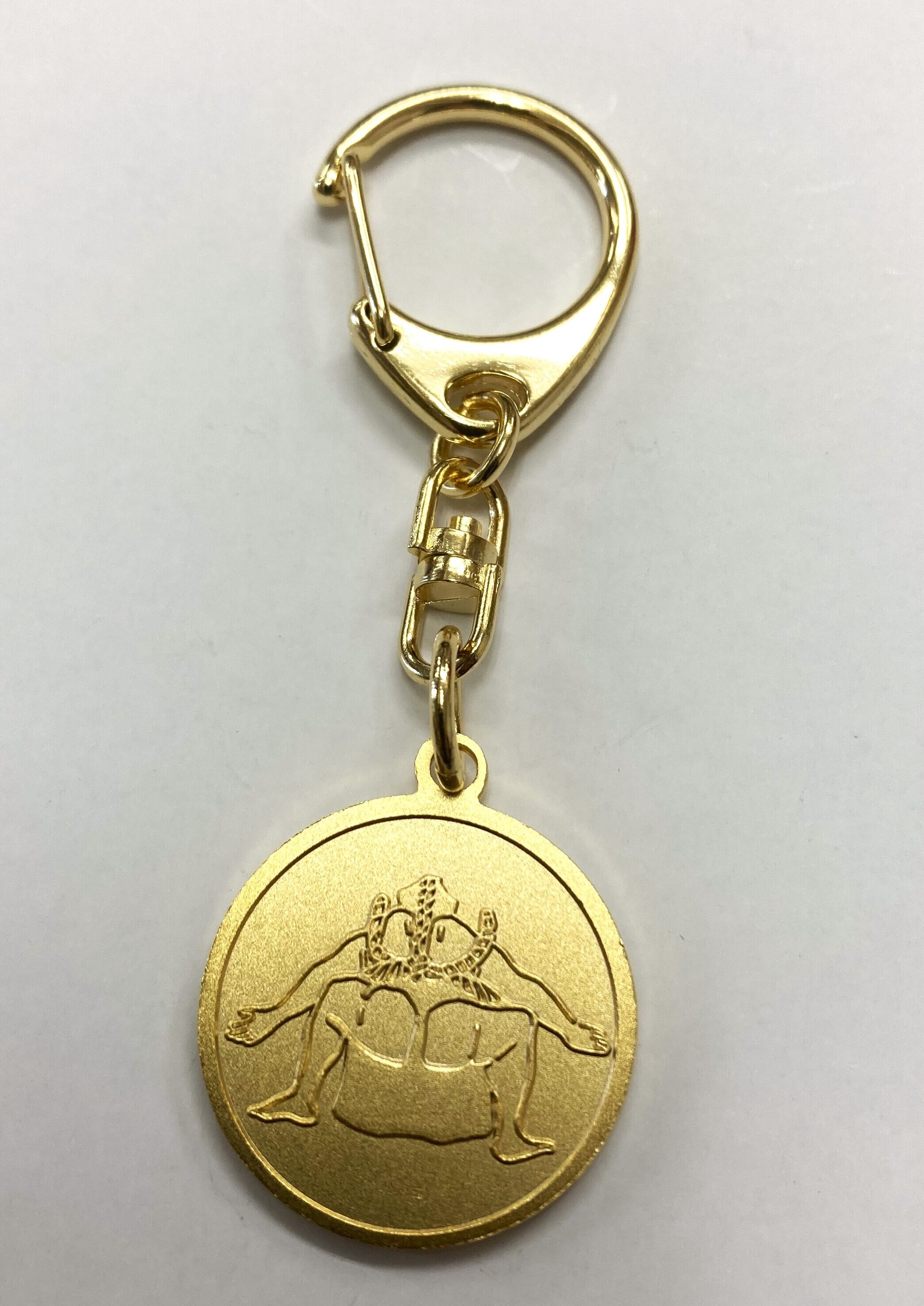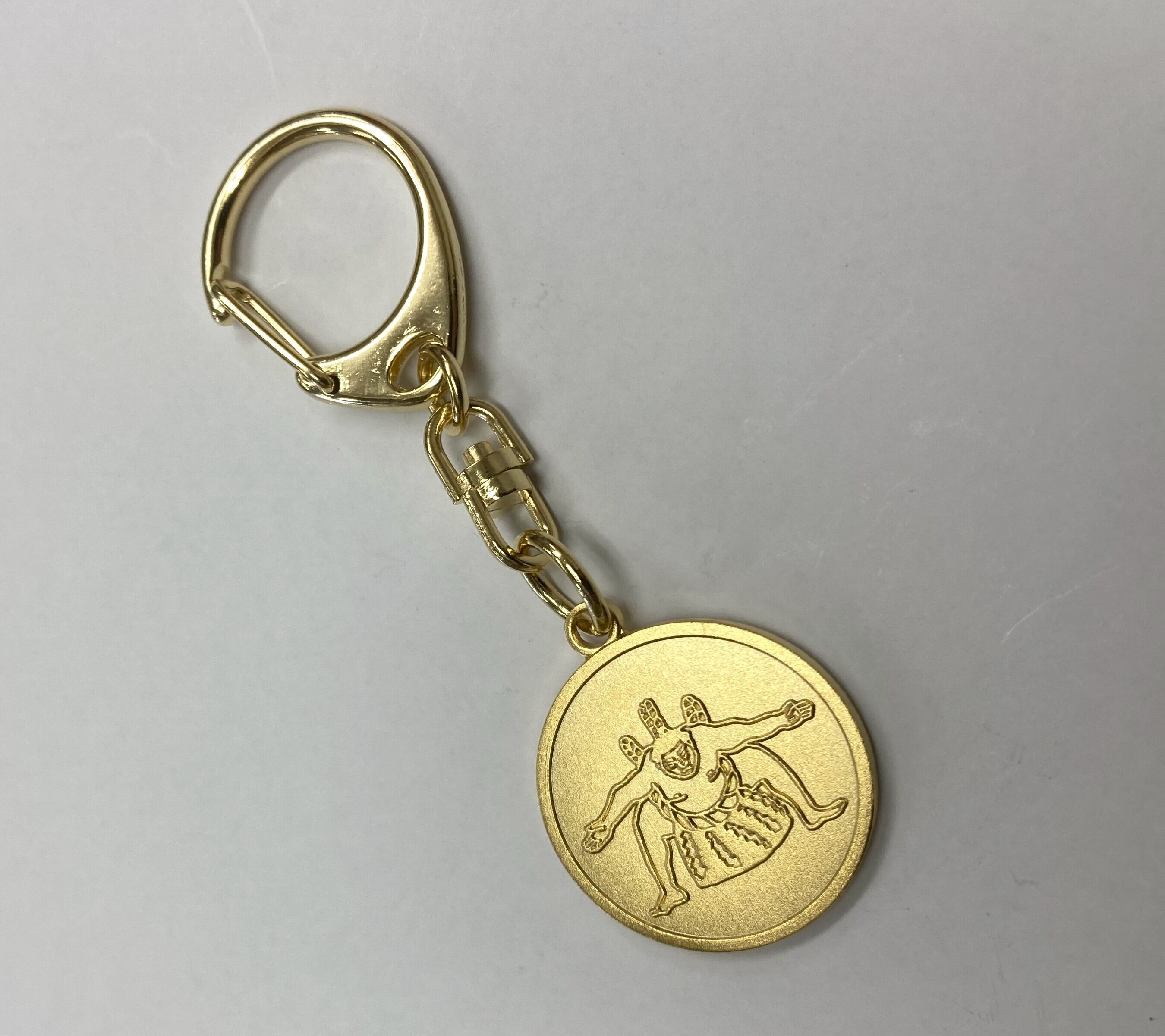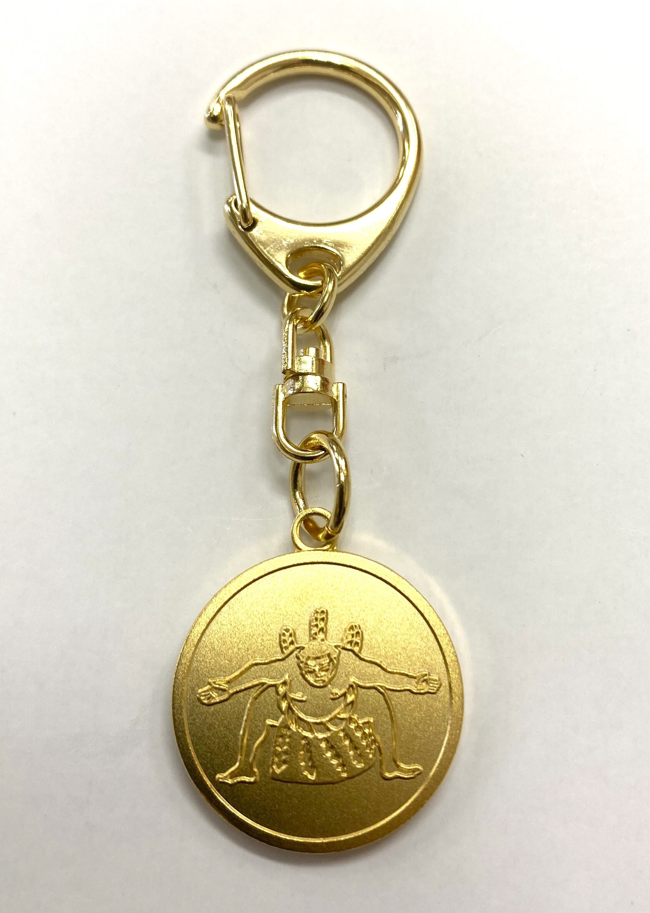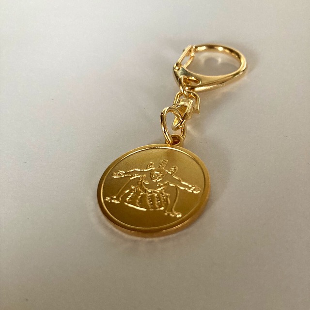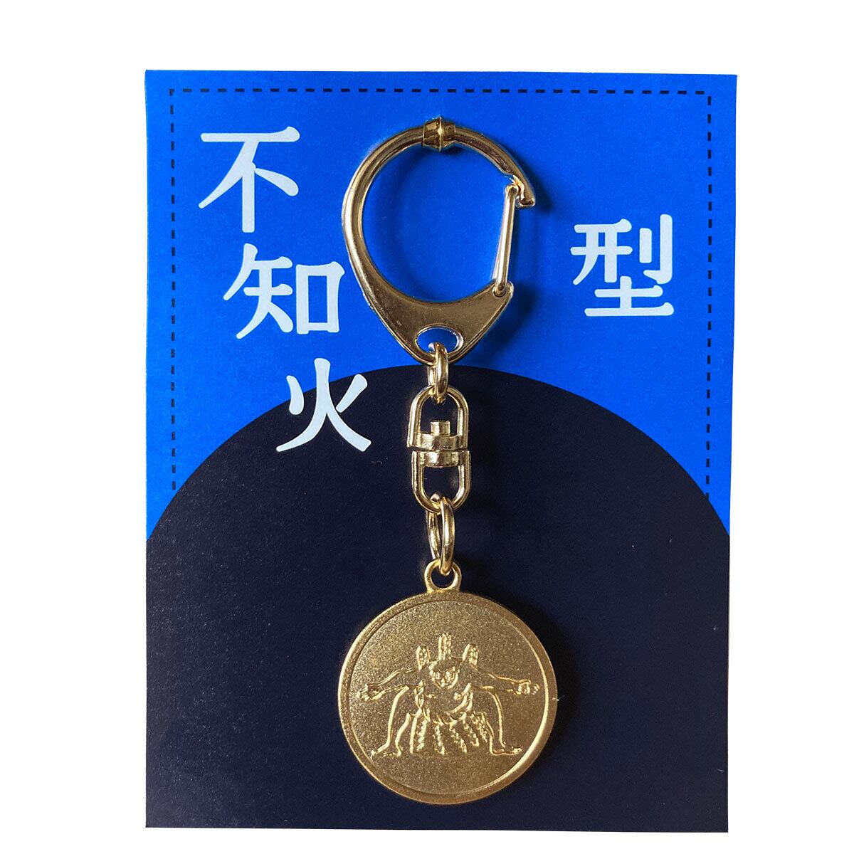 面白可愛い雑貨のお店「花籠や」のイラストを使用したキーホルダーです! 「攻めの型」、不知火型をゴールドのコインにあしらったシンプルで渋い雰囲気! 「正面」と「背面」の両面仕様になっています サイズ:コイン部分25㎜・全長75㎜ 素材:真鍮・留め具部分:鉄