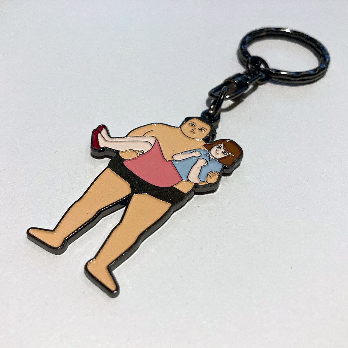 面白可愛い雑貨のお店「花籠や」のイラストを使用したキーホルダーです! 力士のお姫様抱っこの型抜きになっていてインパクト大です! サイズ:全長11cm・幅3.5㎝ 素材:合金