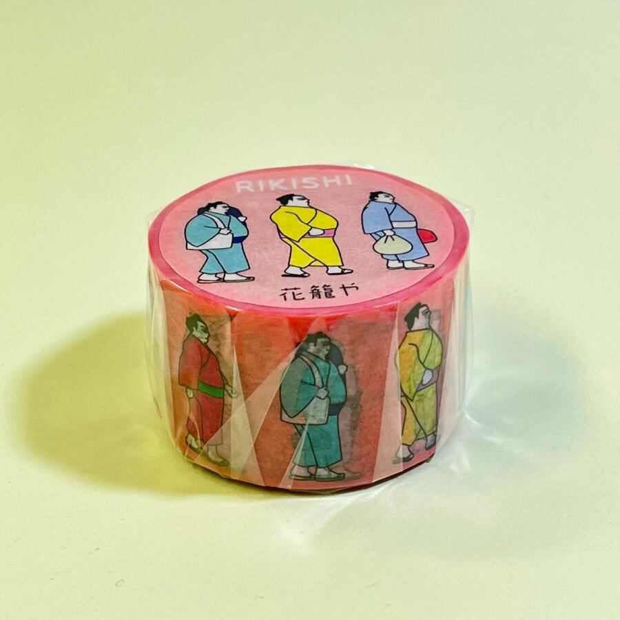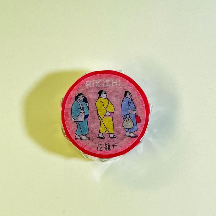 お相撲さんの場所入りマスキングテープ 色とりどりの着物を着たお相撲さんが長い長い行列を作っています。 ※テープ製造の工程上、デザインピッチの変わり目に薄く線が入ります(画像3枚目参照) ・サイズ:25mm×5m 素材:和紙 【made in japan】
