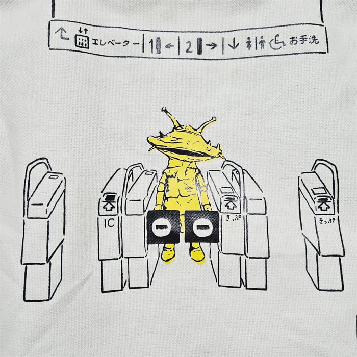 改札口に迷い込んだカネゴンがかわいいイラストのバッグです。