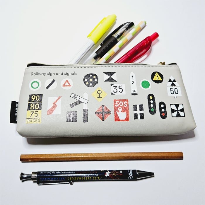鉄道(電車)に関係する様々な標識や信号が描かれたかわいいペンケースです。