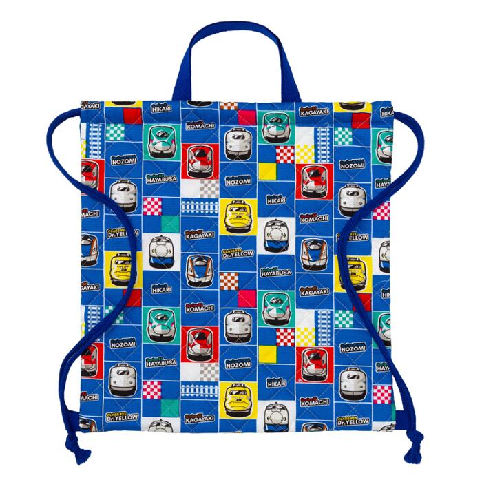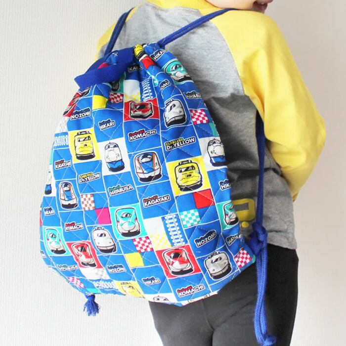 いろいろな新幹線がイラストされたかわいいキルトナップサックです。