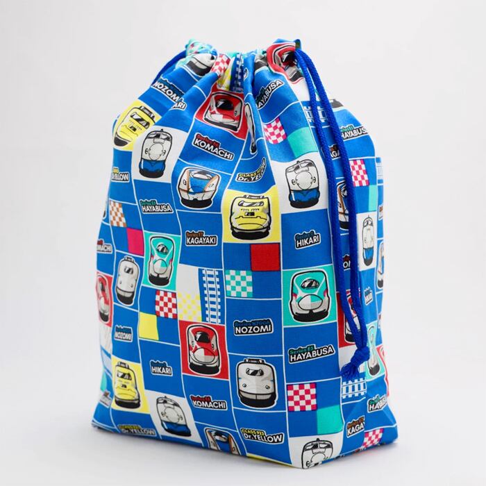 いろいろな新幹線がイラストされたかわいい巾着のLサイズです。