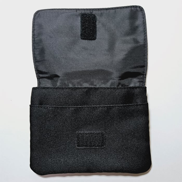 ズボンやスカートのウエスト部分にパチンとワンタッチでつけられる小さなポケット型のバッグです。